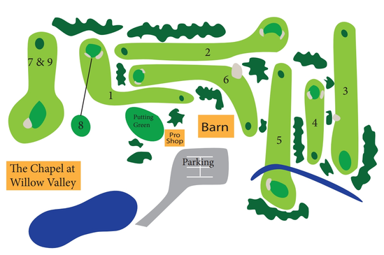 Willow Valley Golf Course is open to the public, and players are welcome to join for an impromptu round—no tee times required! Highlights of the par-32 course include: water features, elevation changes, landmarks such as a barn and a chapel, and rolling green vistas.